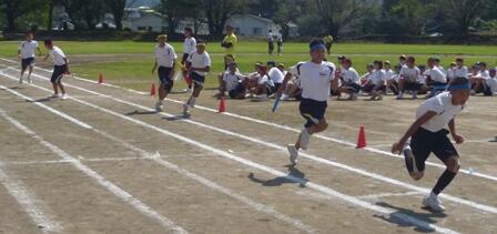 3年生の学級対抗リレーの練習の様子。さて、本番では何団が勝つかな?