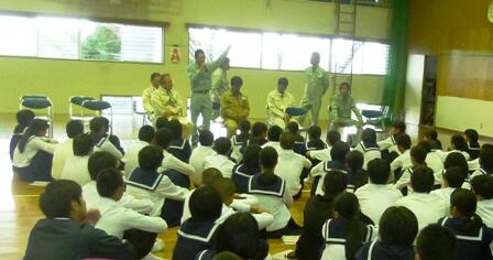 進路学習で、2年生は今、職業について勉強しているところです。来週には職場体験学習が実施されますが、それに先立って、本日は、串間土木事務所と串間市建設業協会青年部の方々がお見えになって、建設業についていろいろなことを教えてくださいました。