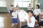 事前に全校生徒で「暑中見舞いカード」を作成しました。今日は、一緒に遊んだり、クイズや合唱をした後、中学生が高齢者お一人お一人に暑中見舞いカードを手渡しました。その後は、楽しくおしゃべりをしたり肩をもんだりしながら有意義な時間を過ごしました。