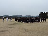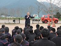 1月15日(金)6校時に火災の避難訓練を行いました。今回は、避難場所を中学校前の多目的広場にしました。串間消防署から2名の方にお越しいただき、講話をいただいた後に、消火訓練を行いました。小雨が降り始めたので、消火訓練は学校の中庭で行いました。各学年の代表の生徒が、教えていただいてとおりに手際よく商活動を行うことができました。
