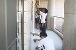 はじめに、全員で窓ふきなどの清掃を行いました。その後、音楽部による演奏が行われ、入所者の皆さんと一緒に心地よい時間を過ごしました。奉仕活動を終えた後の生徒たちのすがすがしい顔がとても印象的で、すばらしい笑顔でした。今日のこの活動をとおして、また一回り成長した大束中学校の生徒たちでした。