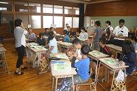 今日は、英語活動を大束中学校小田淳子先生、体育を大束中学校武田孝子先生が行いました。元気のいい小学生を前に二人の先生方も楽しそうに授業をされていました。