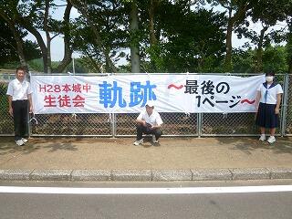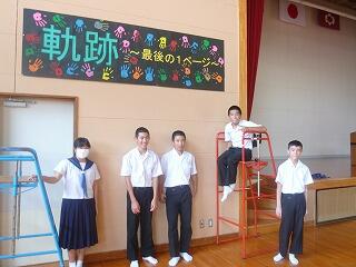 生徒総会で決定したスローガン「軌跡~最後の1ページ~」の横断幕を校門と体育館へ掲げました。暑い日が続く中、生徒会役員を中心に、みんなで時間をかけて作成しました。閉校までみなさんを見守ってくれるでしょう。