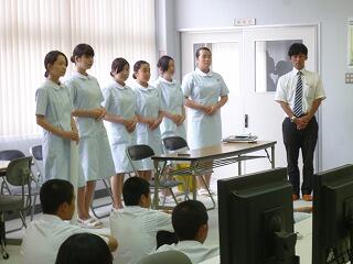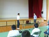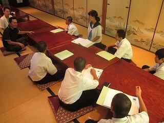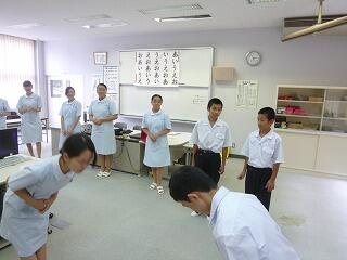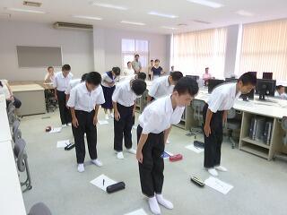 7月13日(水)の5、6校時は、夏休み予定の職場訪問や職場体験の事前学習として、礼法教室を開催しました。日章学園高校よりトータルエステティック科の生徒6名、先生1名が来てくださいました。高校生の元気のよい挨拶や説明、きびきびした模範所作に、こちらまで元気をいただきました。声の出し方の練習方法や体の曲げ方等、大変参考となりました。