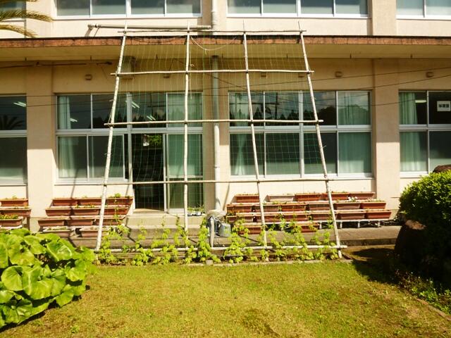 職員室の南側にゴーヤの苗を植え、すくすくと育っています。