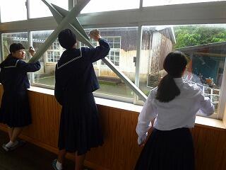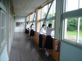 バドミントン部の学校をきれいにするボランティア活動は、今日は雨のため、生徒校舎の窓ふきでした。地区中体連の大会まで約三週間、心・技・体が充実した最高の状態で試合に臨んで欲しいと思います。