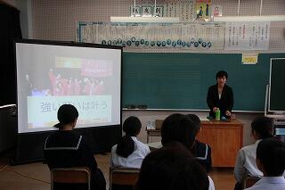 今日は、県立小林高等学校女子バスケットボール部監督の前村かおり先生に講師としてお越しいただいて、「第一回夢を育むキャリア教育講演会」を実施しました。“強い願いは叶う”という演題で、先生のバスケットボール選手として、また、指導者としての経験をもとに素晴らしいお話をお聴きすることができました。