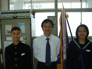 校長室の女子バドミントン部の優勝旗をバックに記念撮影!!