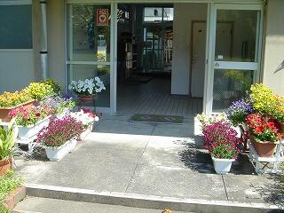 今日は、雲ひとつない快晴です。玄関の花々や校長室の