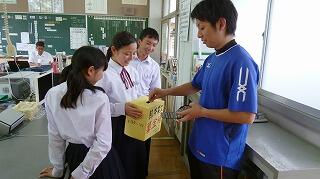 校長室で生徒の様子や教育活動についてご説明した後、授業の様子を見ていただきました。一年生は国語、二年生は英語、三年生は理科の授業でしたが、三年生の理科は、電気分解の実験で興味深そうにご覧になっていました。