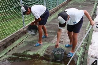 今日の午後はプール清掃でした。今日は暑い一日でしたが、午後になって雲が出てきて、思ったよりも暑さを感じずに活動ができました。生徒と先生方の協力でプールがとてもきれいになりました。生徒達は、6月9日(木)のプール開きから始まる水泳の授業を楽しみにしています。