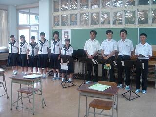 朝の時間に生徒集会をグラウンドで行いました。生徒会役員、学習委員長、生活委員長の話、二学期の花壇コンクールの説明の後、校歌を運動会の団に分かれて大きな声で歌う練習をしました。