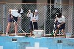 デッキブラシで、壁や底の汚れを落とし、きれいにしました。とても暑い中での作業でしたが、全員のがんばりでとてもきれいになりました。
