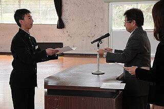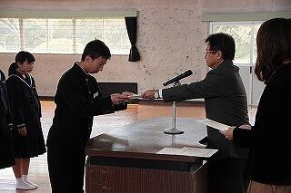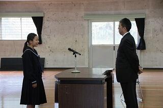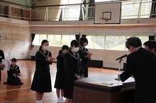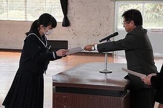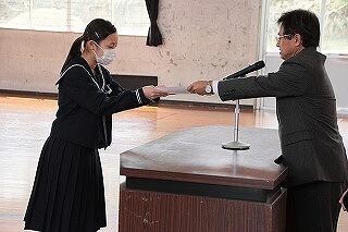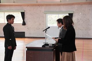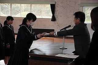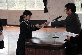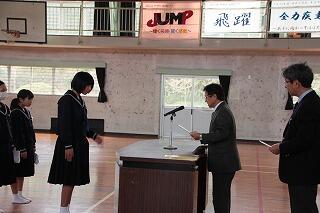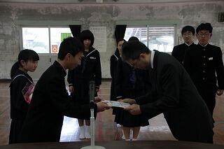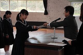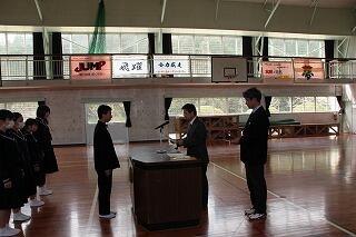 本年度の修了式を行い、1年生1名、2年生7名に修了証を授与しました。1年生谷端天然君、2年生日髙優美さん、生徒会日髙亜佳梨さんの各代表生徒が1年間の取組について、学習面や生活面、部活動などについての反省を発表しました。また、1年間無遅刻無欠席の皆勤賞と朝自習テストの成績優秀者の表彰も行いました。