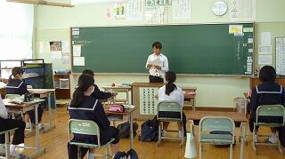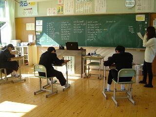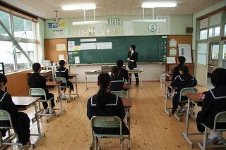 また、串間市では全部の小・中学校で英語表現の授業が行われています。今日は、ALTのシモン先生と英語担当の湯川先生のティームティーチングでの授業でした。1年生は生徒が1名ですので、2対1の大変恵まれた授業です。オールイングリッシュで会話を中心とした中身の濃い充実した授業が行われていました。