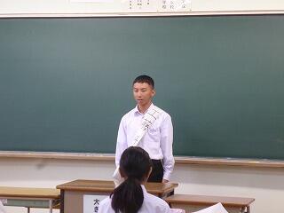 それぞれの立候補者が、今の市木中学校の現状や課題、解決策等のついて発表しました。「自分からもっと大きな声であいさつができるようにする。」、「自力登校ができる学校にしたい。」、「地域の活動に積極的に参加する学校にしたい。」など、全員が素晴らしい考えを発表してくれました。