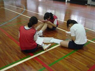 2年生の体育の授業はバスケットボールで、3対2の場面での攻撃の方法について作戦を考える授業でした。