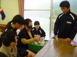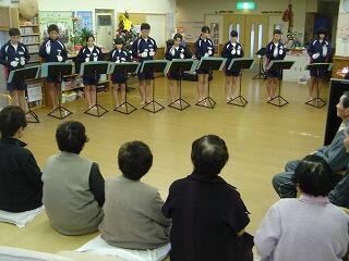 今日の午後は、市木ディサービスに全校生徒で訪問しました。自分たちで準備した福笑いやビンゴゲーム、じゃんけんゲームなどをして楽しく交流をした後、最後に、ハンドベルの演奏をしました。行く途中、強い雨と風で大変でしたが、高齢者の方々にとても喜んでいただきました。