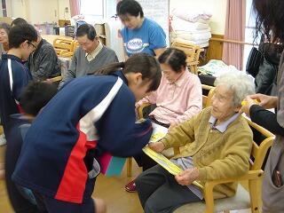 今日の午後は、市木ディサービスに全校生徒で訪問しました。自分たちで準備した福笑いやビンゴゲーム、じゃんけんゲームなどをして楽しく交流をした後、最後に、ハンドベルの演奏をしました。行く途中、強い雨と風で大変でしたが、高齢者の方々にとても喜んでいただきました。