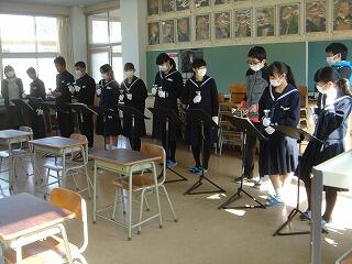 当日の閉校式典では、生徒達がハンドベル演奏と『市木の未来』
