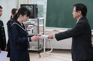 朝の時間に、新しい生徒会役員の認証式を行いました。先日の選挙の結果、新しく生徒会長に決まった東濵佳奈さんをはじめ、5名の生徒会役員に任命証を授与し、生徒会長の大山瑛美さんをはじめ、旧生徒会役員3名に感謝状を贈りました。