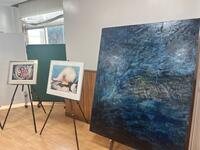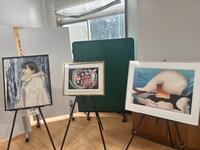 校長室前のスペースに突如、美術作品の数々が展示されました。