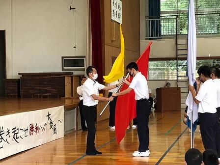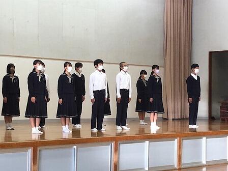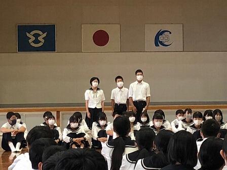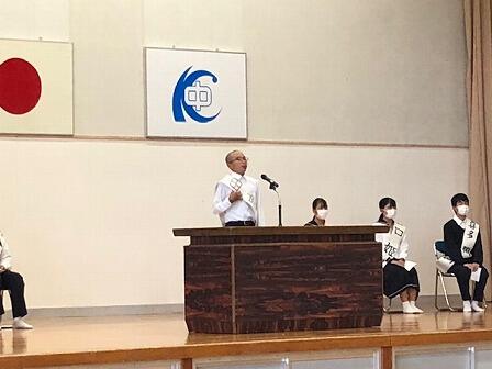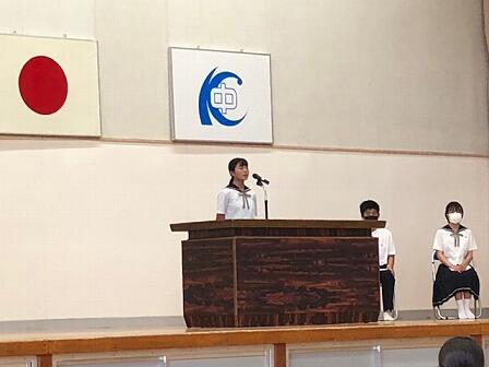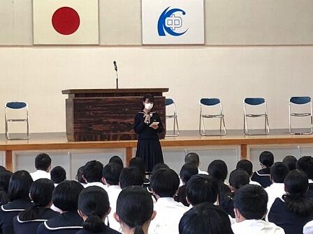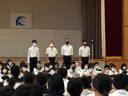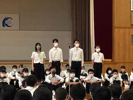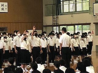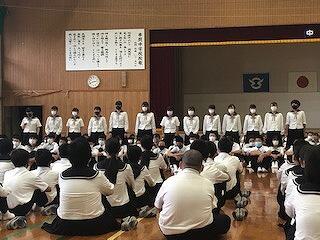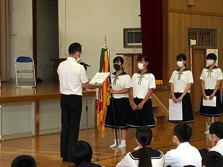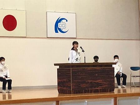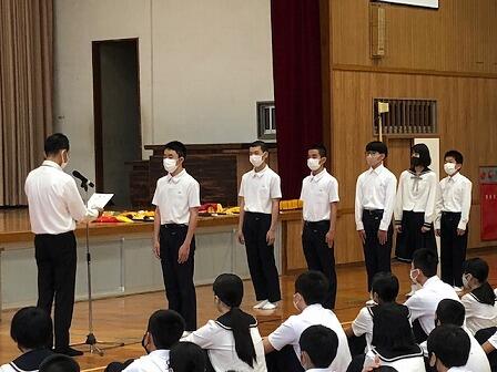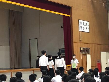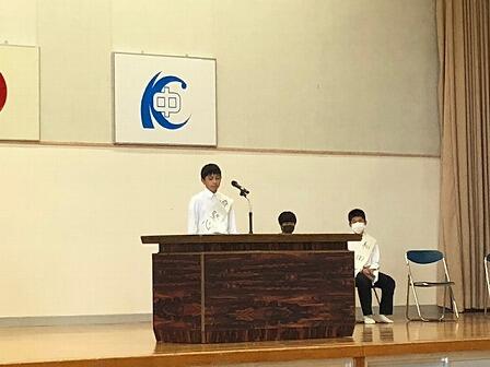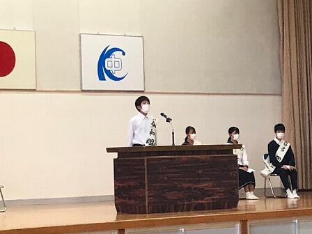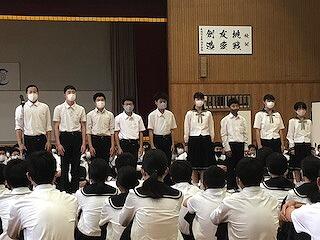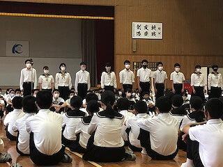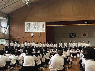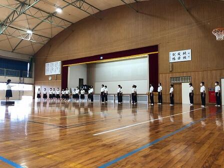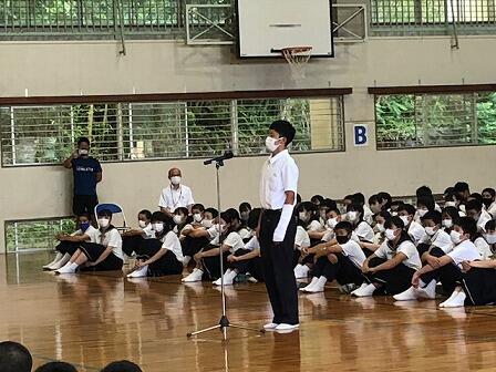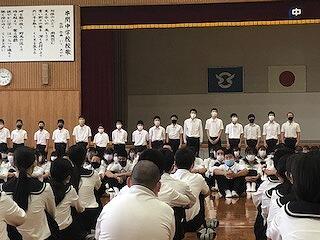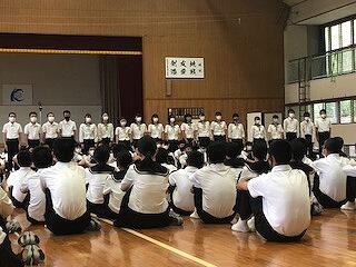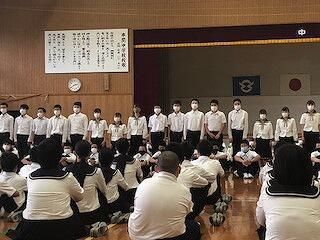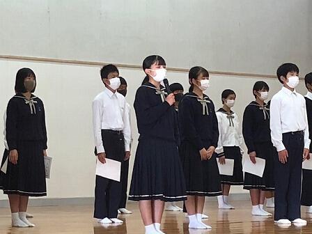 地区大会に向けて部活動生の激励式を行いました。式では、バドミントン部主将が代表挨拶、野球部と女子バスケットボール部主将が力強い宣誓を行ってくれました。練習試合等もままならないなかでの大会になりますが、串間市の代表として、各競技での健闘を祈ります。