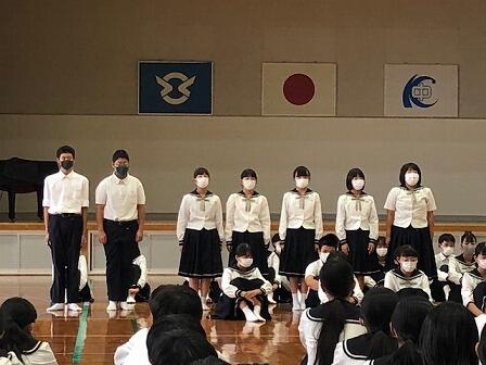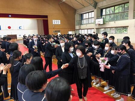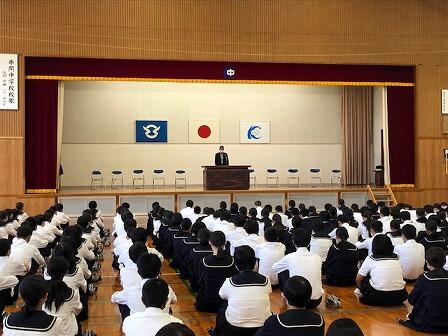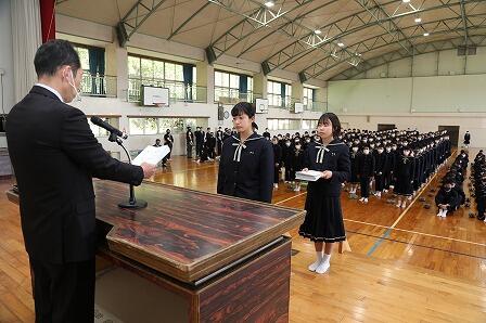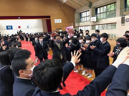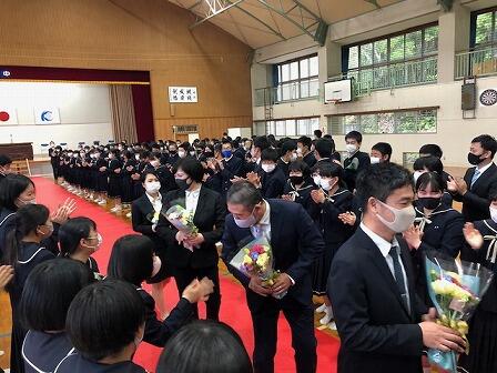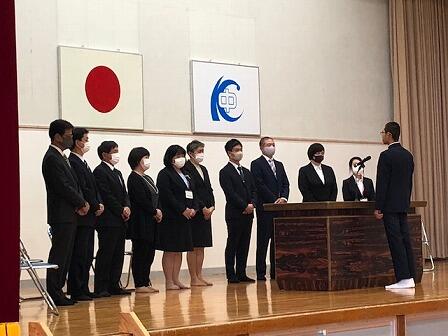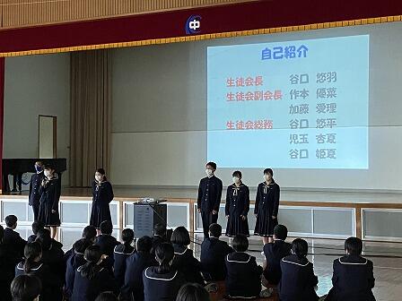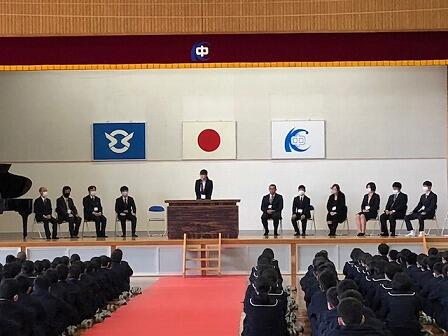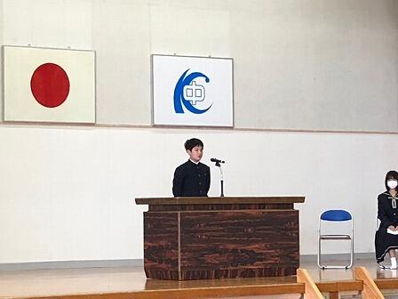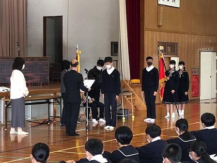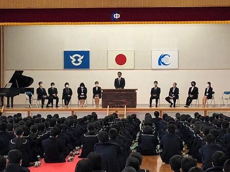 6日、令和3年度の始業の日を迎えました。始業式に先立ち11名の先生方の新任式が行われました。生徒会長からの歓迎のあいさつの後、全校生徒揃って元気よくあいさつできました。