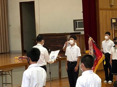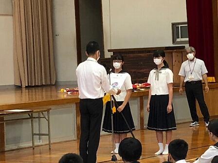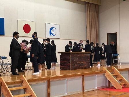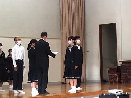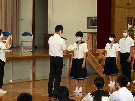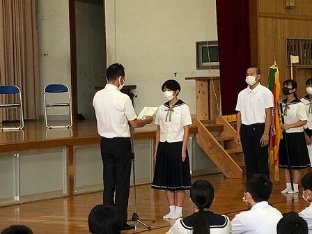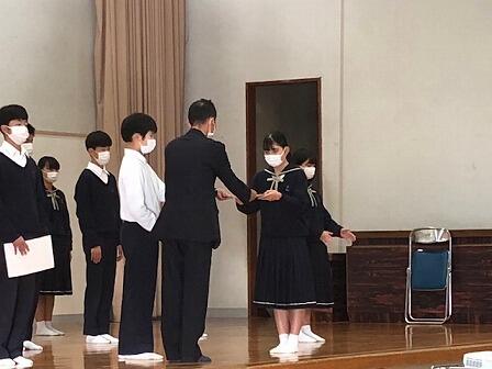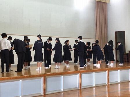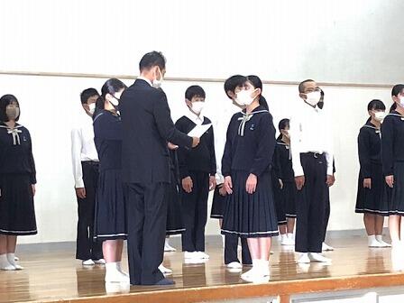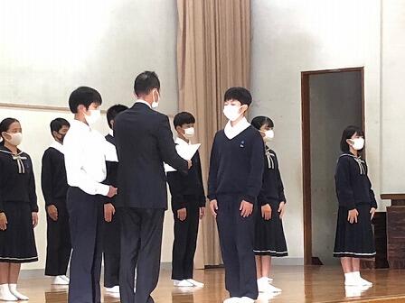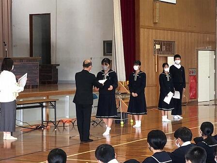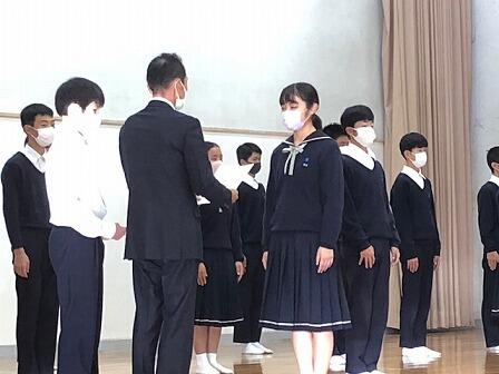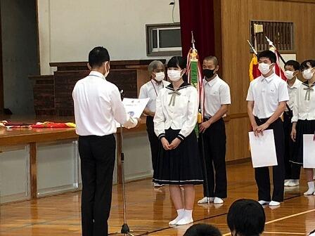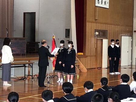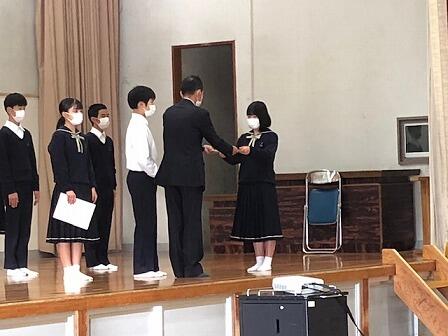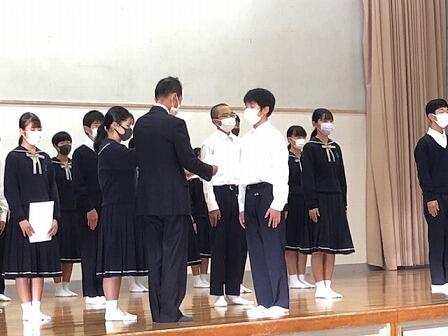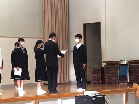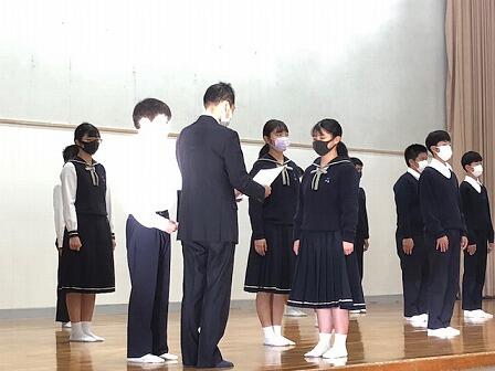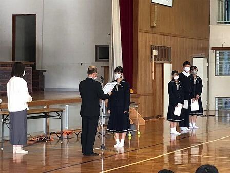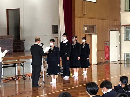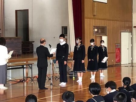26日、修了式に先立ち、串間市社会福祉協議会より本校に感謝状に贈呈がありました。コロナ禍の今年度、生徒会が中心となった「手作りマスク」「シトラスリボン運動」「コロナに負けない宣言」などの取組が評価されました。令和3年度も今年度以上に、「チーム串間」として生徒、教職員が一つになって串間市を盛り上げてまいります。