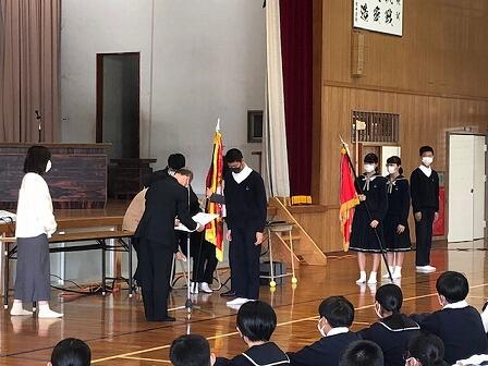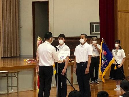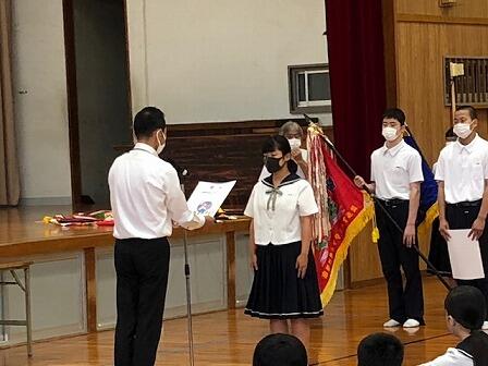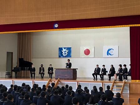 16日の全校集会の様子です。2学年の2学期の振り返りと秋季体育大会の結果をうけて、優勝旗等校納および各種表彰を行いました。
