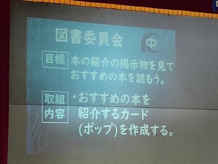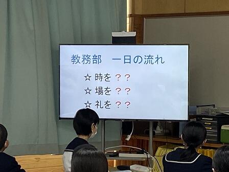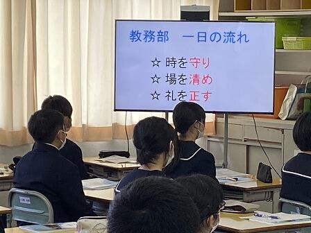 各委員会の目標や具体策について、各学級で意見を出しました。1年生については不慣れな討議でしたが、生徒会役員の上手なサポートで、活発な意見がだされていました。