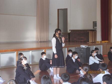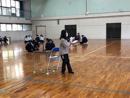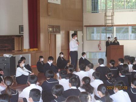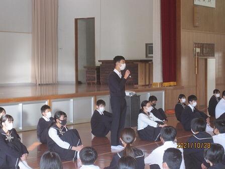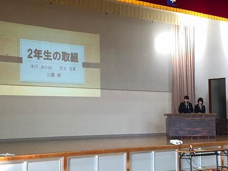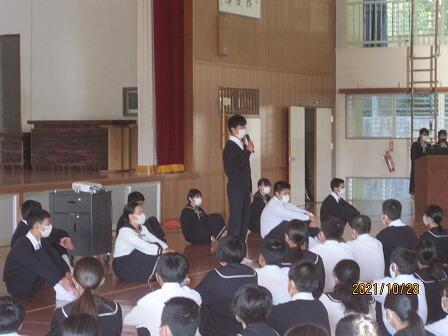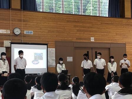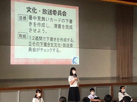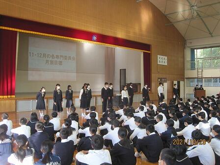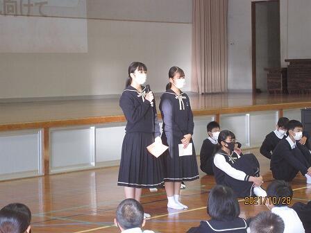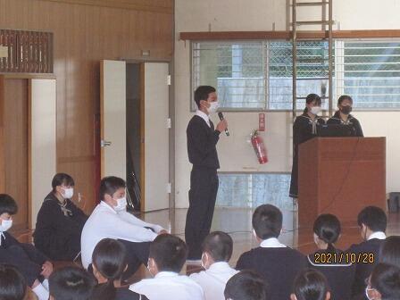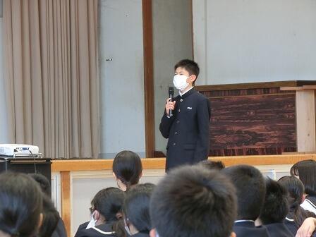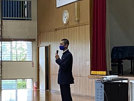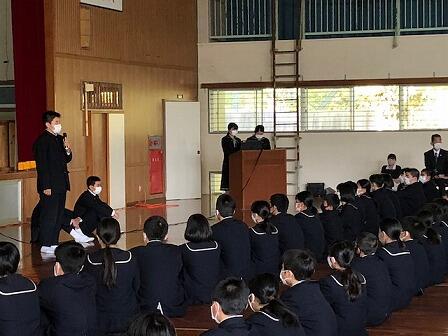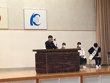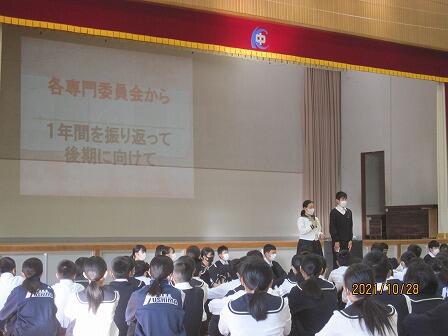 第4期生徒会役員による最後の生徒集会の様子です。各専門委員長、副委員長から「1年間をふりかえって、後期にむけて」が発表されました。各委員を務めた生徒の皆さん、これまでの活動に敬意を表します。お疲れさまでした。