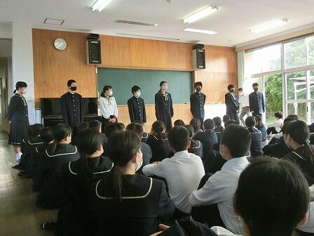 6日、1年生の学年集会の様子です。GW中の大きな事故もなく、元気に登校できました。各学級の委員長、副委員長の紹介や、学年委員長、副委員長の紹介がありました。