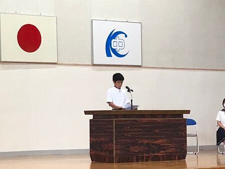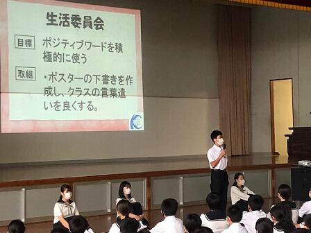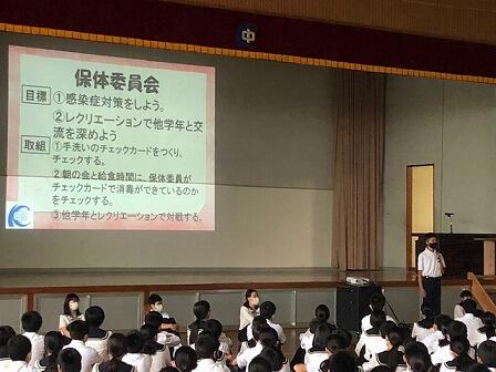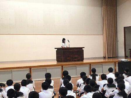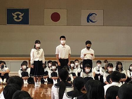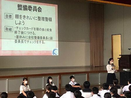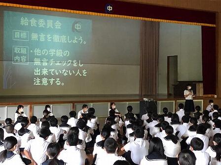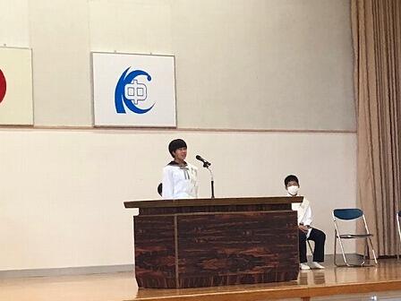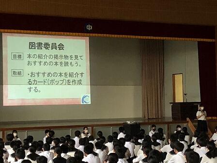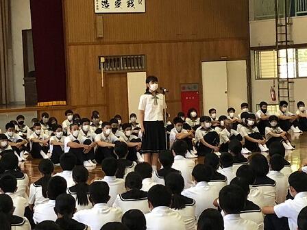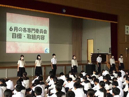 6月の生徒集会の様子です。各委員会の目標と取組、生徒総会での決定事項について執行部から説明がありました。後半では、第1学年委員長が入学して現在までの感想を発表してくれました。