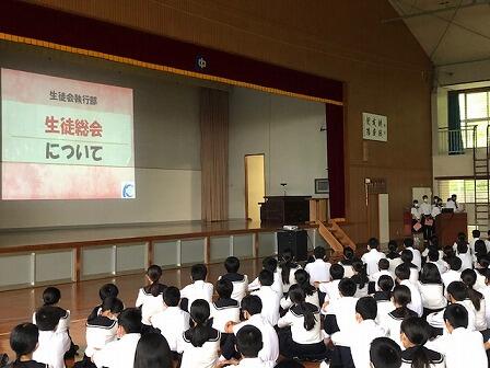 写真は20日の生徒集会の様子です。5月25日に行われる生徒総会に関する説明を生徒会役員が行いました。初参加となる1年生にもわかりやすい説明でした。今後、数回の学級討議が計画されています。充実した生徒総会になるよう真剣に話し合いに参加しましょう。