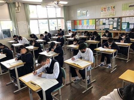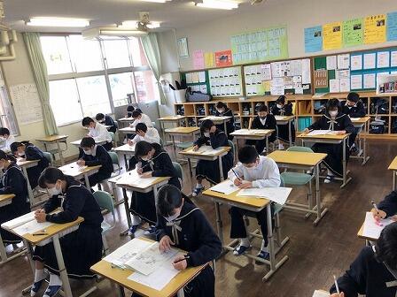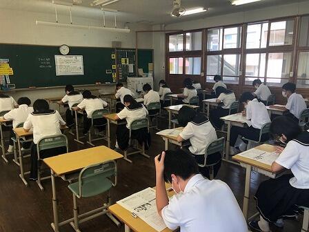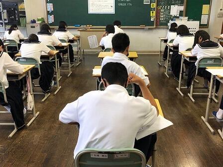 今週水曜日から期末テストが始まりました。1、2年生は本日までの実施です。どのクラスも真剣に取り組んでいました。写真は1年3組と4組の様子です。