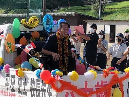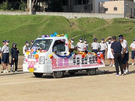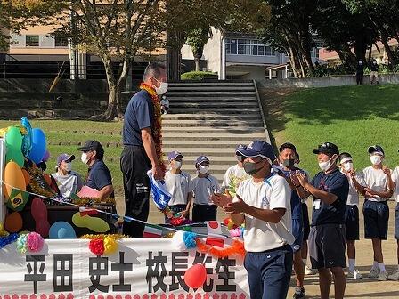体育大会終了後に、今年度で本校を退職される、平田史士校長先生の還暦を全校生徒で祝いました。