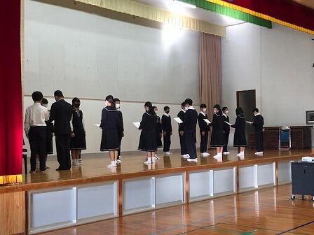 26日、修了の日を迎えました。学年代表2名が修了証を受け取り、本年度の教育課程は全て終了しました。各学年代表の1年間の反省、次年度への抱負の発表後、学校長から、次学年への決意についての話がありました。「自立」「自学」「自力」のいっそうの充実に向けて、各自が目標もって取り組んでいきましょう。