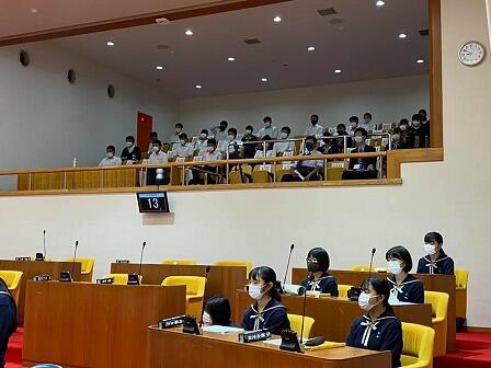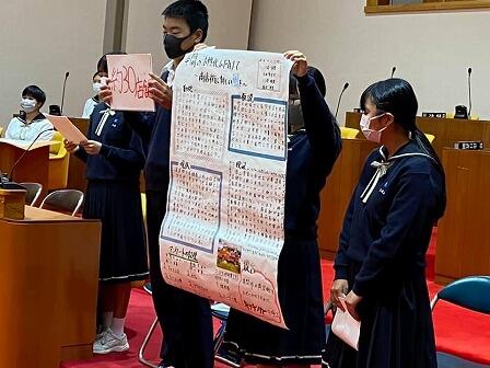 3年生が、総合的な学習の時間に学んだことを、市議会会場にて、市長、副市長、各課長に5つのテーマから提言を行いました。