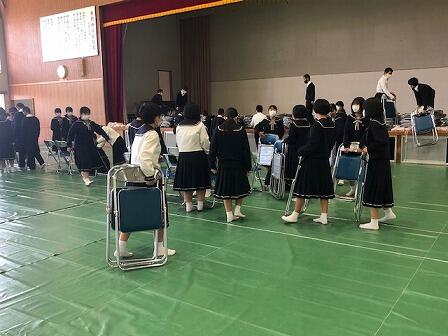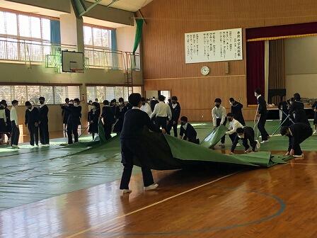 26日(金)中学校説明会でした。市内の小学6年生が一同に会し、中学校の概要を聞きました。写真は会場を設営する1年生の様子です。24日は一貫教育研究発表大会も本校で行われ、この会場設営も1年生が行ってくれました。