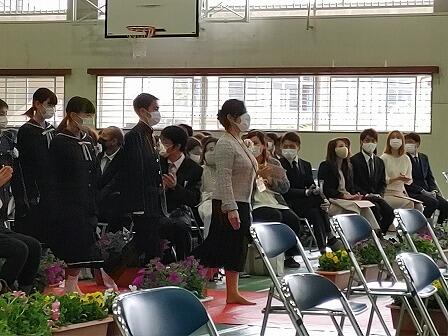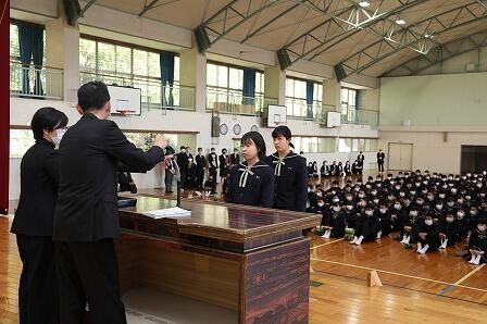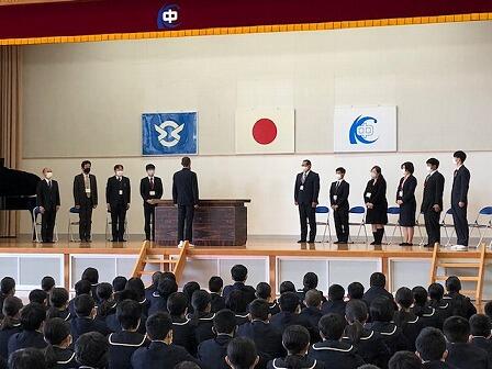 6日、令和3年度の始業の日を迎えました。始業式に先立ち11名の先生方の新任式が行われました。生徒会長からの歓迎のあいさつの後、全校生徒揃って元気よくあいさつできました。