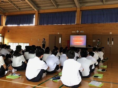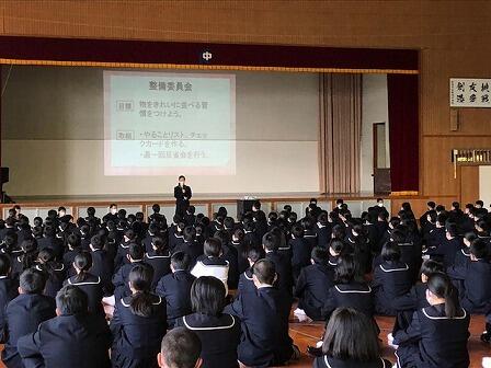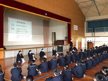 写真は20日の生徒集会の様子です。5月25日に行われる生徒総会に関する説明を生徒会役員が行いました。初参加となる1年生にもわかりやすい説明でした。今後、数回の学級討議が計画されています。充実した生徒総会になるよう真剣に話し合いに参加しましょう。