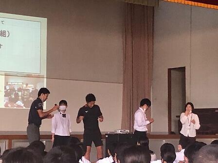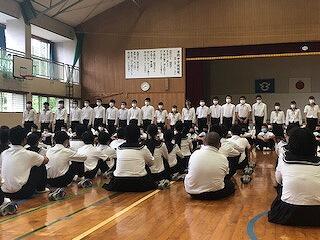15日、県中学校総合体育大会及び、県吹奏楽コンクールに参加する部活動への激励式を行いました。運動部の生徒から大会への意気込みが述べられたあと、吹奏楽部の演奏も披露されました。どの部も悔いのない結果が残せるように頑張ってください。