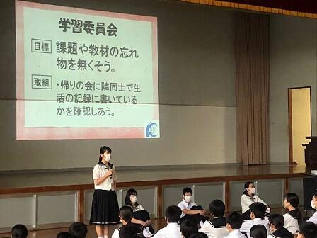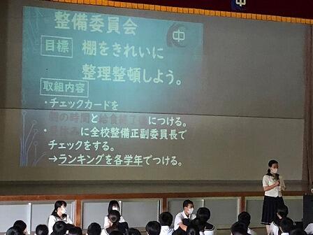 6月の生徒集会の様子です。各委員会の目標と取組、生徒総会での決定事項について執行部から説明がありました。後半では、第1学年委員長が入学して現在までの感想を発表してくれました。