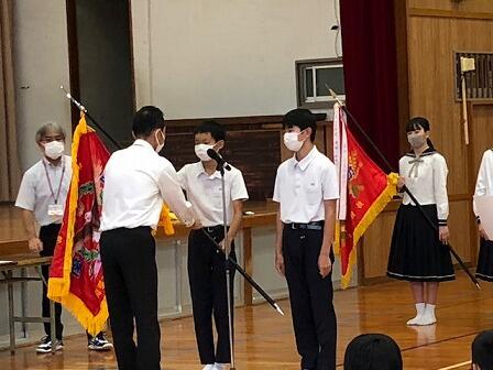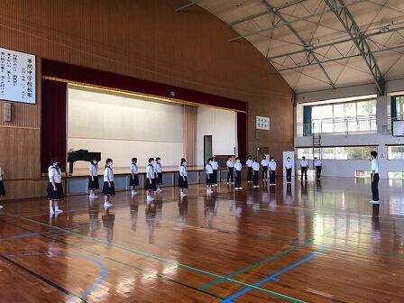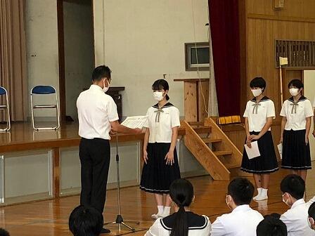 先日から始まった県中学校総合体育大会の表彰、校納式の様子です。地区の代表として激戦を制し、優秀な成績をおさめてくれました。九州大会、全国大会での活躍も期待しています。