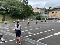 午前中に雨が降り、運動場が使えないこともあり、体育館で校歌の歌唱指導とプール前の駐車場で各団の演武披露を行いました。