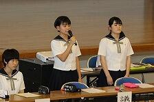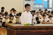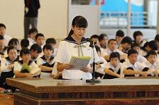 学級役員や学年委員のあいさつなど生徒主導の集会です。写真は1学年に集会の様子です。