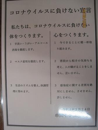 24日、新旧生徒会役員による「コロナに負けない集会」を実施しました。「病気にならないために・・・」「不安にならないために・・・」「差別をうまないために・・・」という3つのテーマで活発な意見交換がなされました。集会後に「自分にできること」を書いて、各教室に掲示しました。