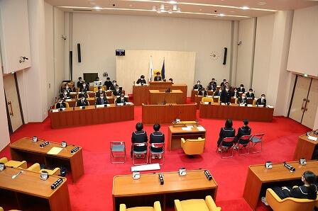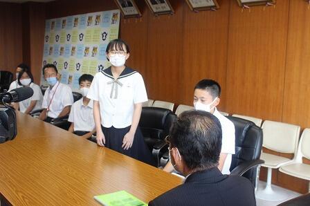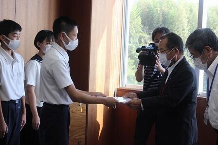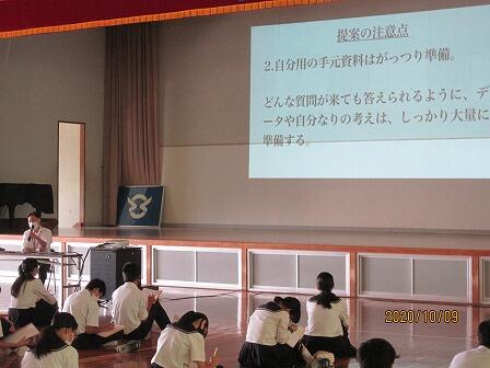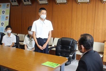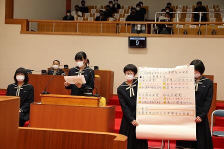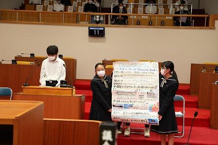 13日、3年生が総合的な学習の時間に取り組んだ「くしま学」の成果を、市役所にて発表する「くしま未来会議」に参加しました。5つのテーマの代表が、「くしまの未来」につながる提言を、発表してくれました。初めての議場での発表ということもあり「緊張した」という生徒が多かったようですが、中学生の目線からの、市の課題についての提言について、副市長からお褒めの言葉をいただきました。