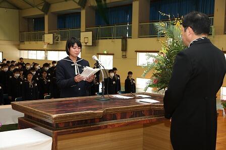 旧役員は「青いドア」「コロナウイルスに負けない宣言」など串間中生徒全員が団結して取り組む活動を提案、実践し、本校の名前を広く知らしめてくれました。お疲れ様でした。新役員の皆さん、公約に掲げた内容を実現し、新たな本校の伝統をつくりあげてください。